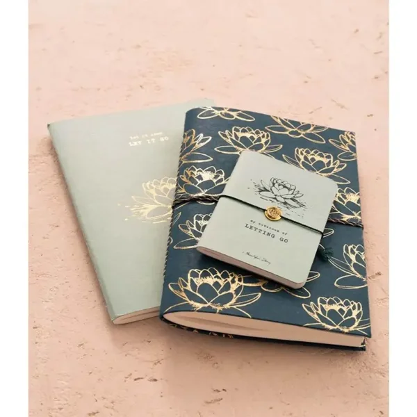 Ontmoet het Notitieboek Lotus. Een gelinieerde notitieboek met 120 pagina's van 140 mm x 210 mm (A5 formaat). Het lichtblauwe notitieboek is bedrukt met een lotus en de tekst: "let it come, let it go."